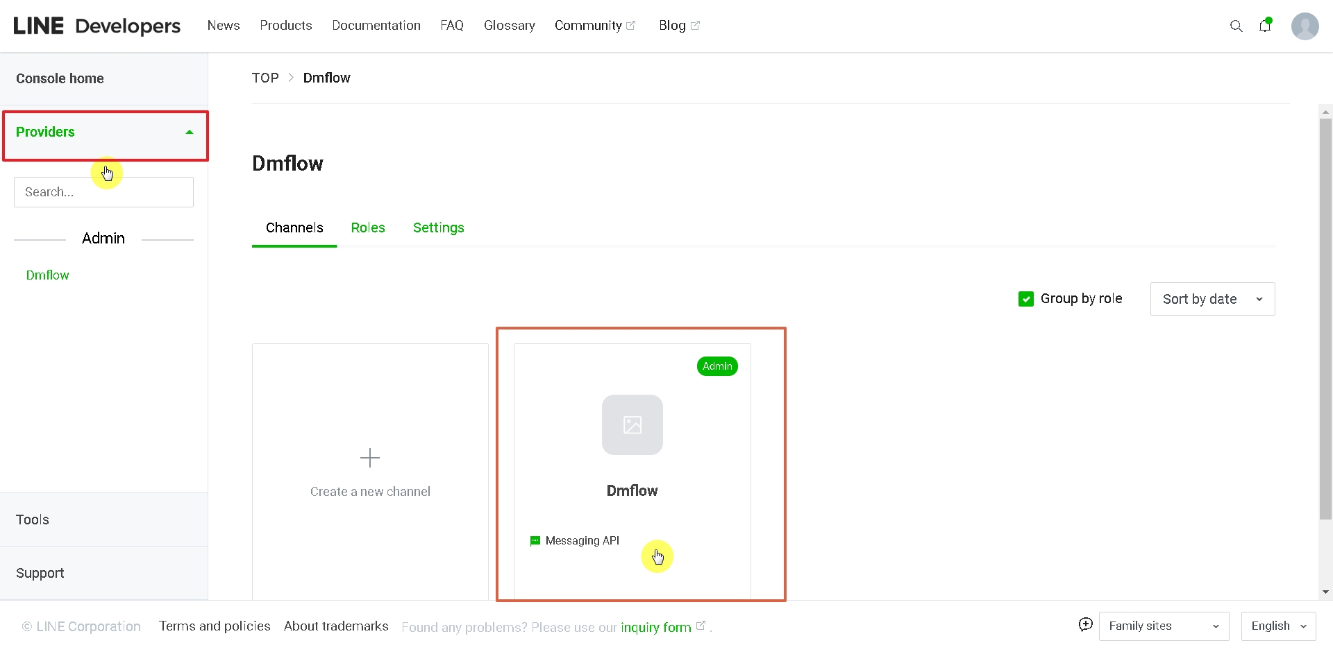 Click the link on the page to enter LINE Developers console, and follow the order in the image below: