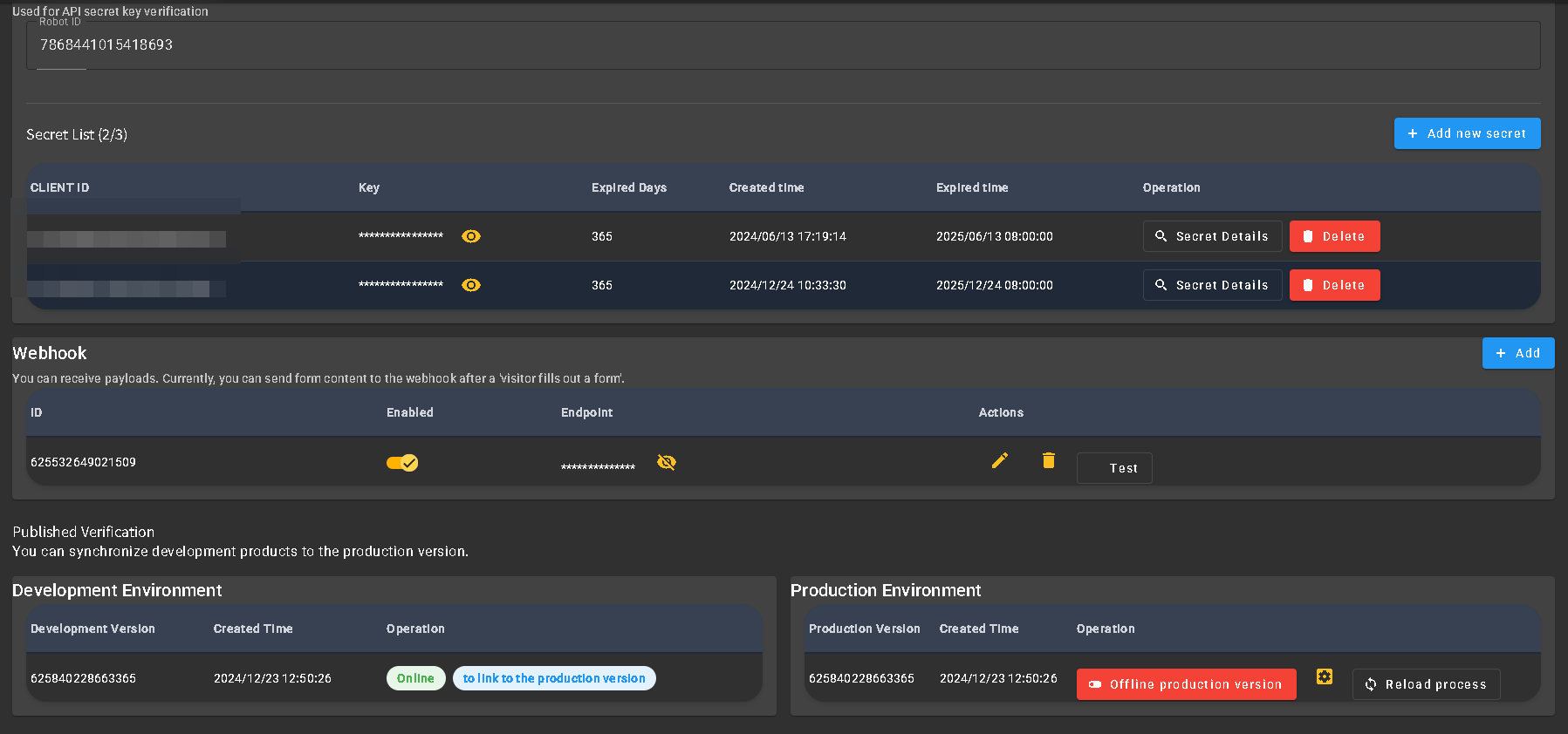 Here manages the keys used to call DMflow API. Please keep these keys safe, as they are credentials for external systems to interact with your bot.