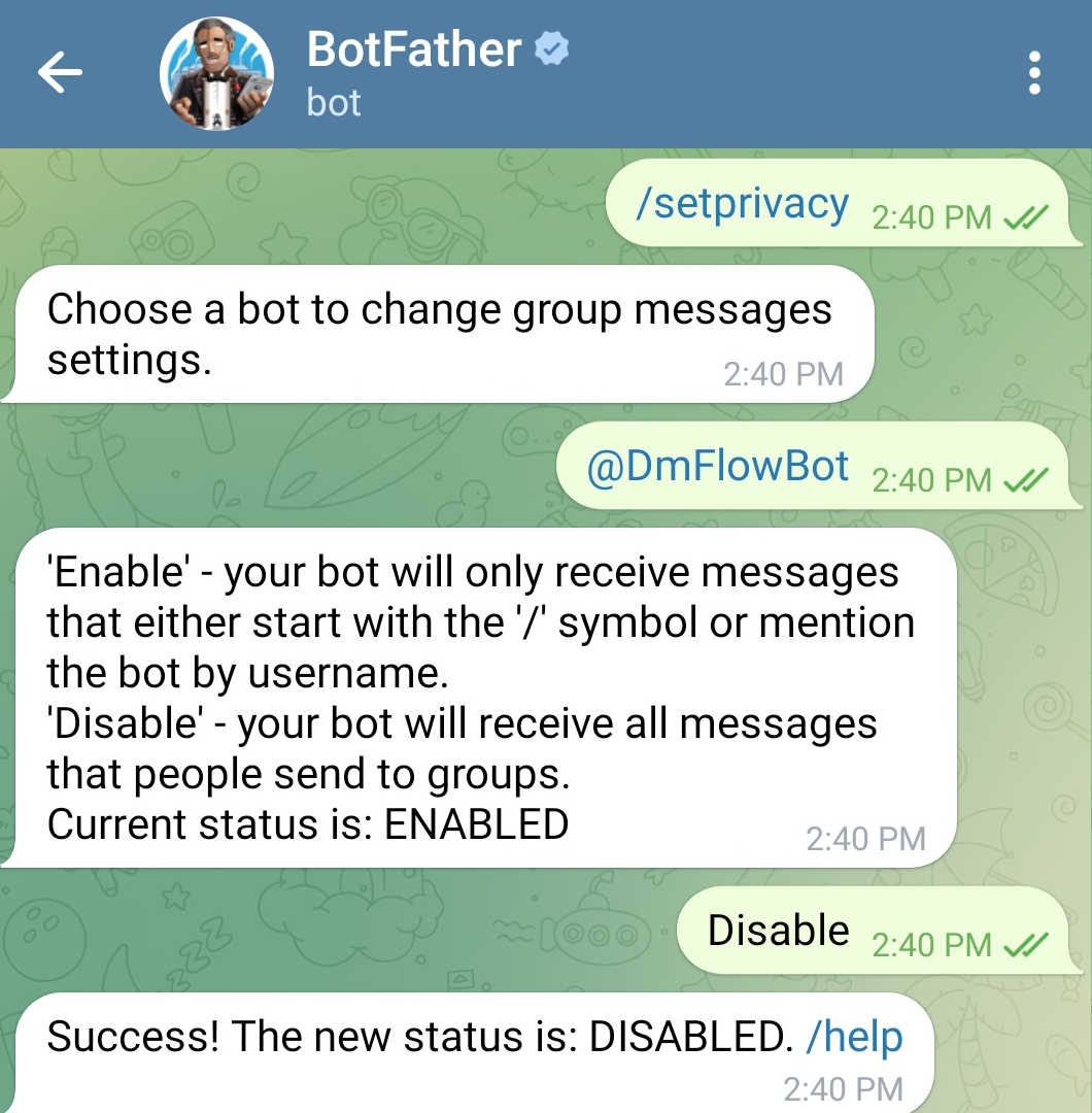 If you want the bot to receive all messages in a group (not just commands starting with /), you need to disable privacy mode.
