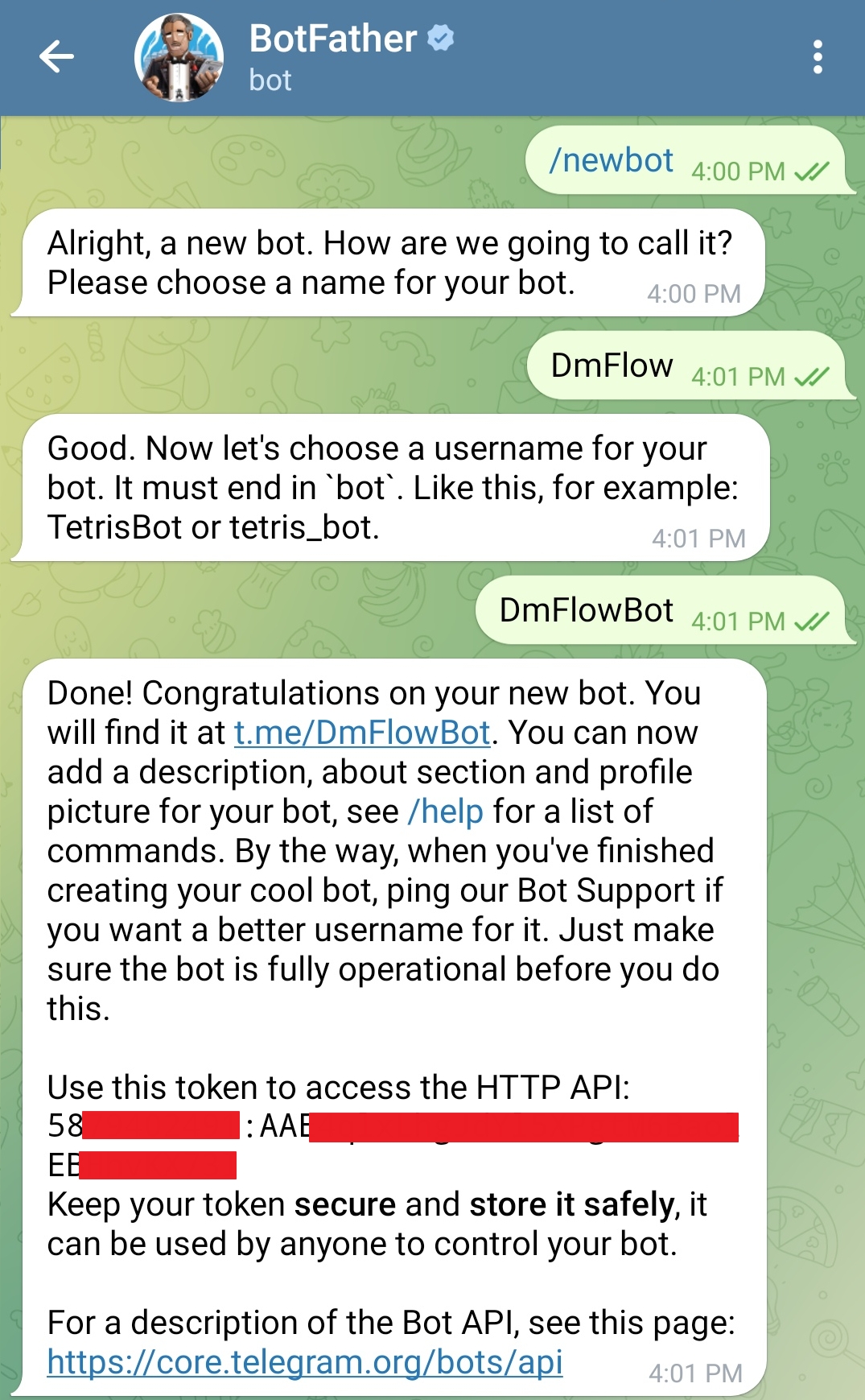 bot(e.g.,dmflow_demo_bot). - Upon success, BotFather will give you an API Token (red masked area in the image below). Please keep this Token safe and do not leak it.