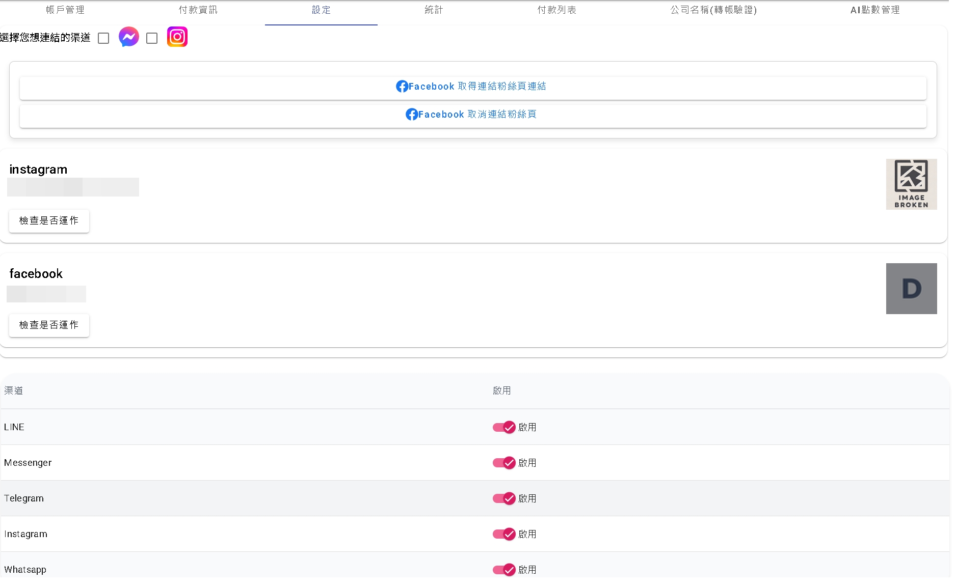 - Channel Integration: Unified management of enabling status and integration settings for third-party channels like LINE, Messenger, Telegram.