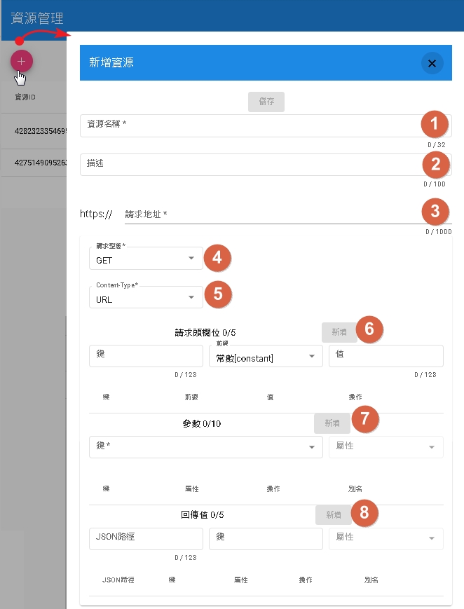 在資源管理中,您需要定義 API 的具體調用方式: